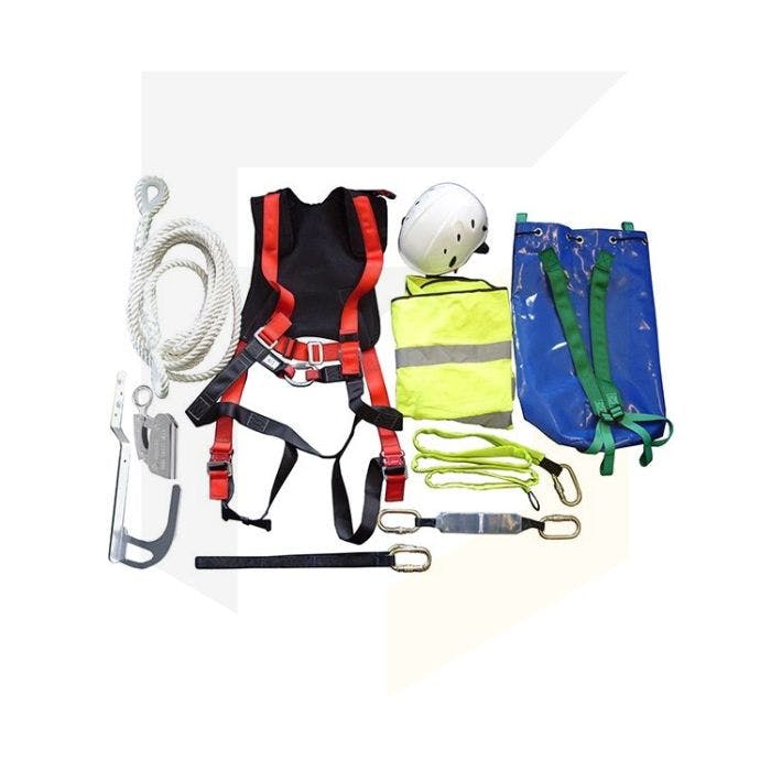 This kit contains a roof anchor, harness, rope, helmet, lanyard and bag for working on roofs