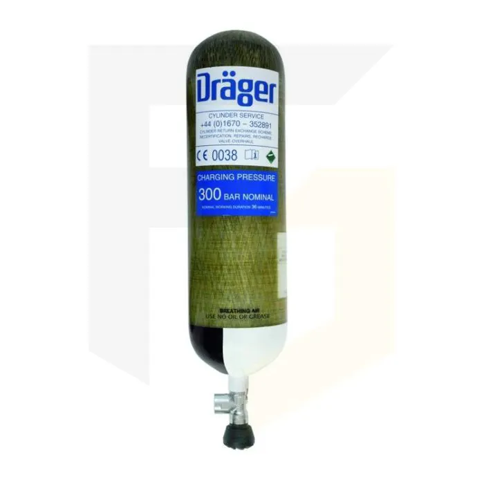 Compressed Air Steel Cylinder from Drager.  In-Line Valve (6L 200 bar - Steel). This product is deemed to be hazardous - please contact Frontline Safety before purchasing this product.
