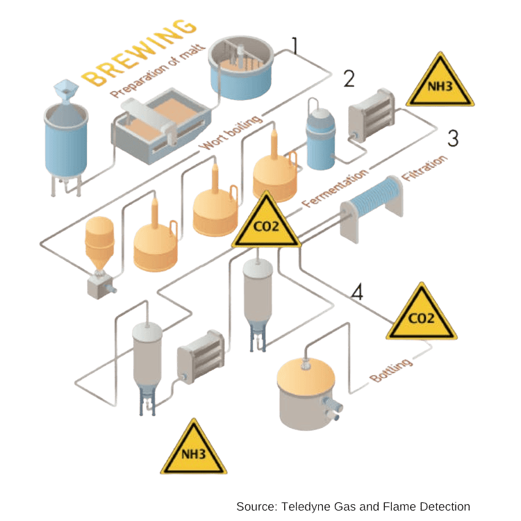 Confined spaces are among the most dangerous areas in breweries. The regions and processes where carbon dioxide might be present in a brewery are the beer storage tanks, pumping stations, bottling areas, silos, and the carbonation process itself. Carbon dioxide gas can accumulate in confined places such as fermentation tanks, kegs, mixing tanks, and silos as a byproduct of the brewing process.